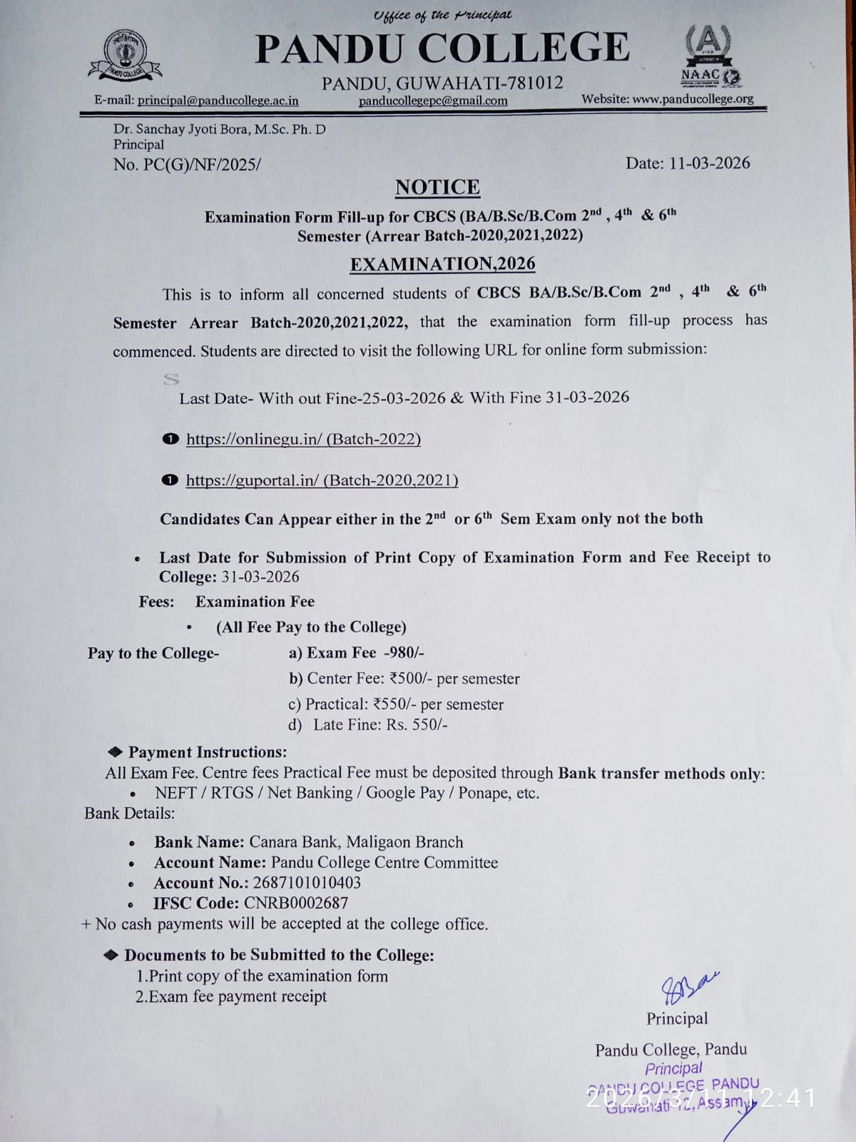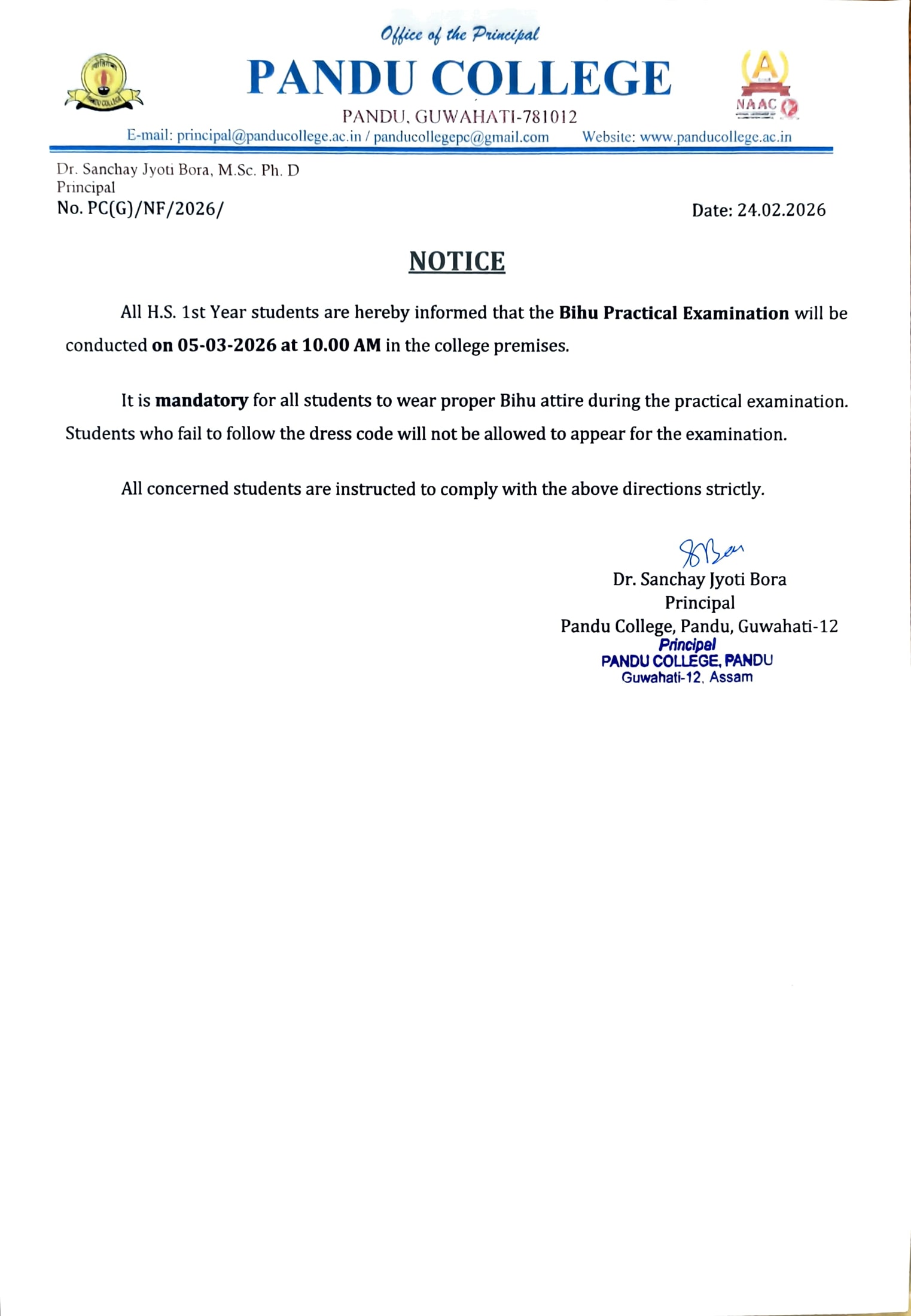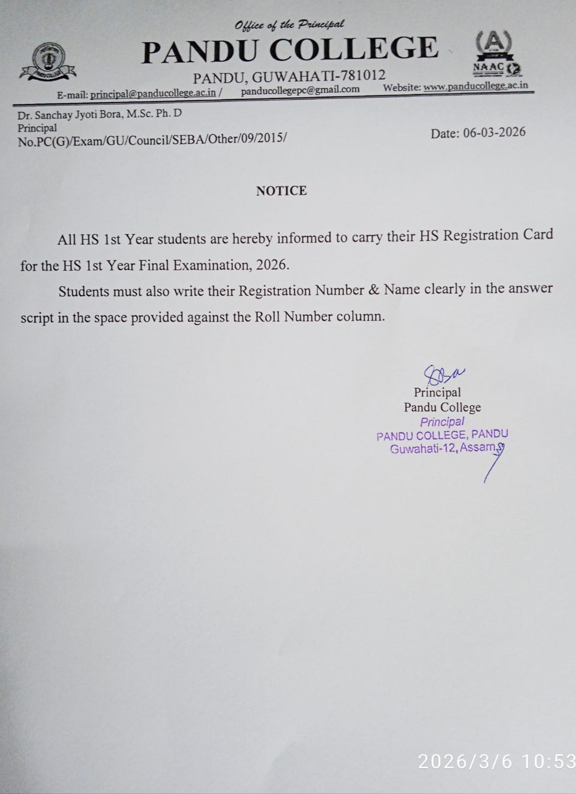 It is hereby notified to all HS Final Examination candidates of Pandu College that, as per the order of the Honourable Deputy Commissioner (DC) of Kamrup (Metro), in connection with the visit of the Hon’ble Prime Minister to Guwahati, all candidates are required to be present on the college campus before 11:30 A.M.