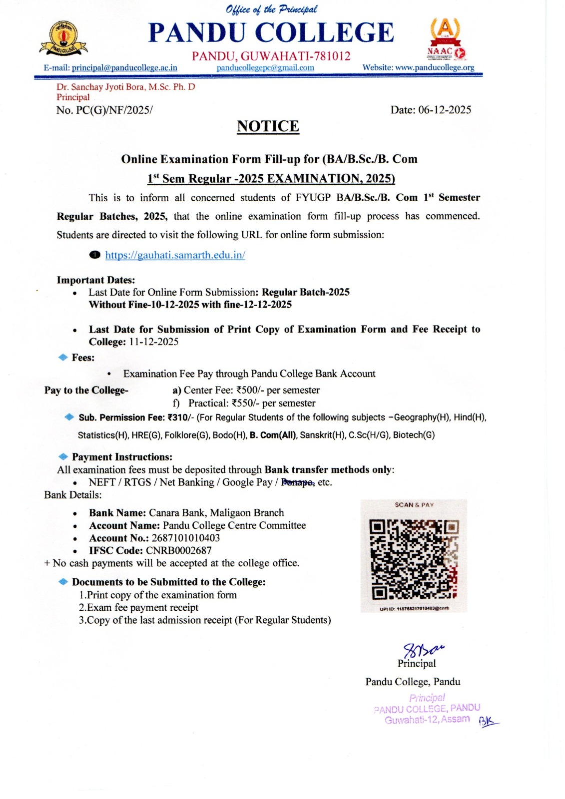 2025-12-06-FYUGP 1ST SEMESTER (REGULAR BATCH 2025) ONLINE EXAMINATION FORM FILL UP OF BA/B.SC/B.COM THROUGH SAMARTH E-GOV PORTAL FROM 5TH DECEMBER’ 2025 TO 10TH DECEMBER, 2025 (WITHOUT FINE) AND UPTO 12TH DECEMBER' 2025 (WITH FINE).-Click Here